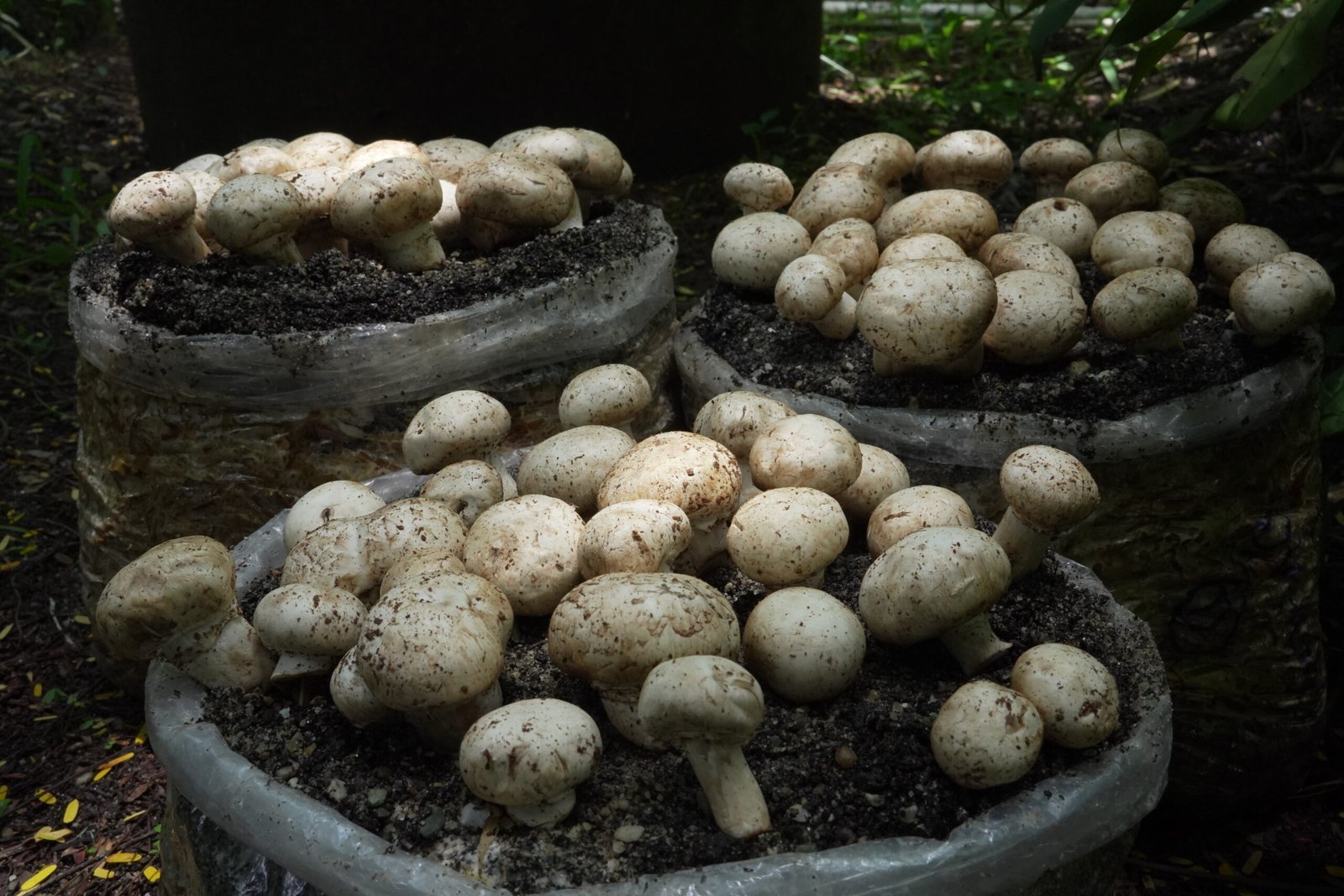 There are a series of stages in the farming of the most widely used commercial mushroom species Agaricus bisporus. These are composting, fertilizing, spawning, casing, pinning, and cropping.